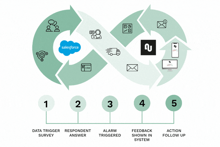 Responses are synchronized into Salesforce, and you now work with feedback directly on contacts, accounts, in reports and dashboards and with automated follow up actions – right there inside your Salesforce.